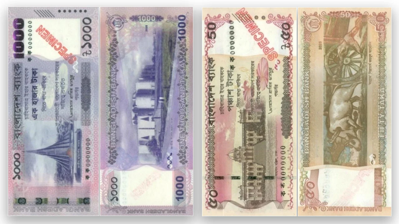 ৫০ টাকার নোট: নতুন ৫০ টাকার নোটে থাকবে জাতীয় জাদুঘরের ছবি এবং বাংলাদেশ ব্যাংক ভবনের ছবি।